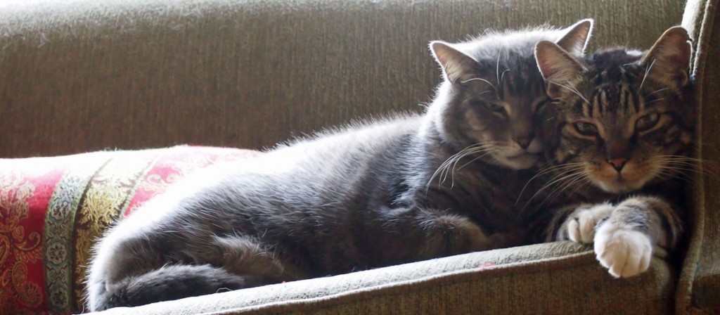 During those first few weeks Pepper took every opportunity to attack and/or terrorize poor Jiggy. Terrified of coming home and finding him dead I kept them separated whenever I was away; Jiggy in the bedroom and Pepper in the livingroom with separate food and water and litter boxes. When I was at home I opened the bedroom door. There’d be skirmishes, but with less frequency. If it got too quiet though I’d freak and make sure Pepper wasn’t administering a killing bite. Eventually Jiggy got big and bold enough not to put up with Pep’s bullying bullshit, and Pepper chilled out. But to this day, whenever I find them like I did this morning snuggled up together on the chippendale, I flash back to a time seven Februaries ago when I never thought there’d be a chance in hell that they’d ever become such close friends. Family even.